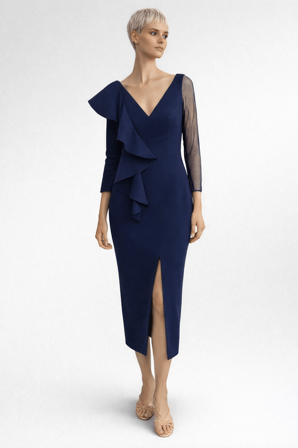 Escote en pico que estiliza la silueta, con diseño asimétrico y detalle de volantes que aportan movimiento. Manga larga combinada con tejido semitransparente y abertura frontal que realza la figura.