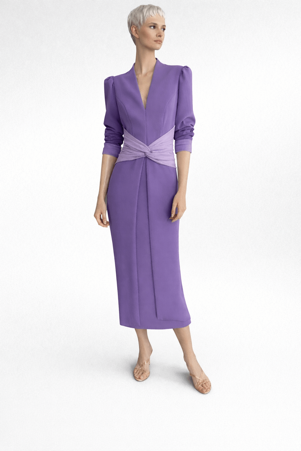 Diseño en tono lavanda con escote en pico profundo que estiliza el cuello y la silueta. Cuerpo entallado con detalle drapeado y nudo central en la cintura que realza la figura. Manga larga con ligero volumen en el hombro para un acabado sofisticado y actual.