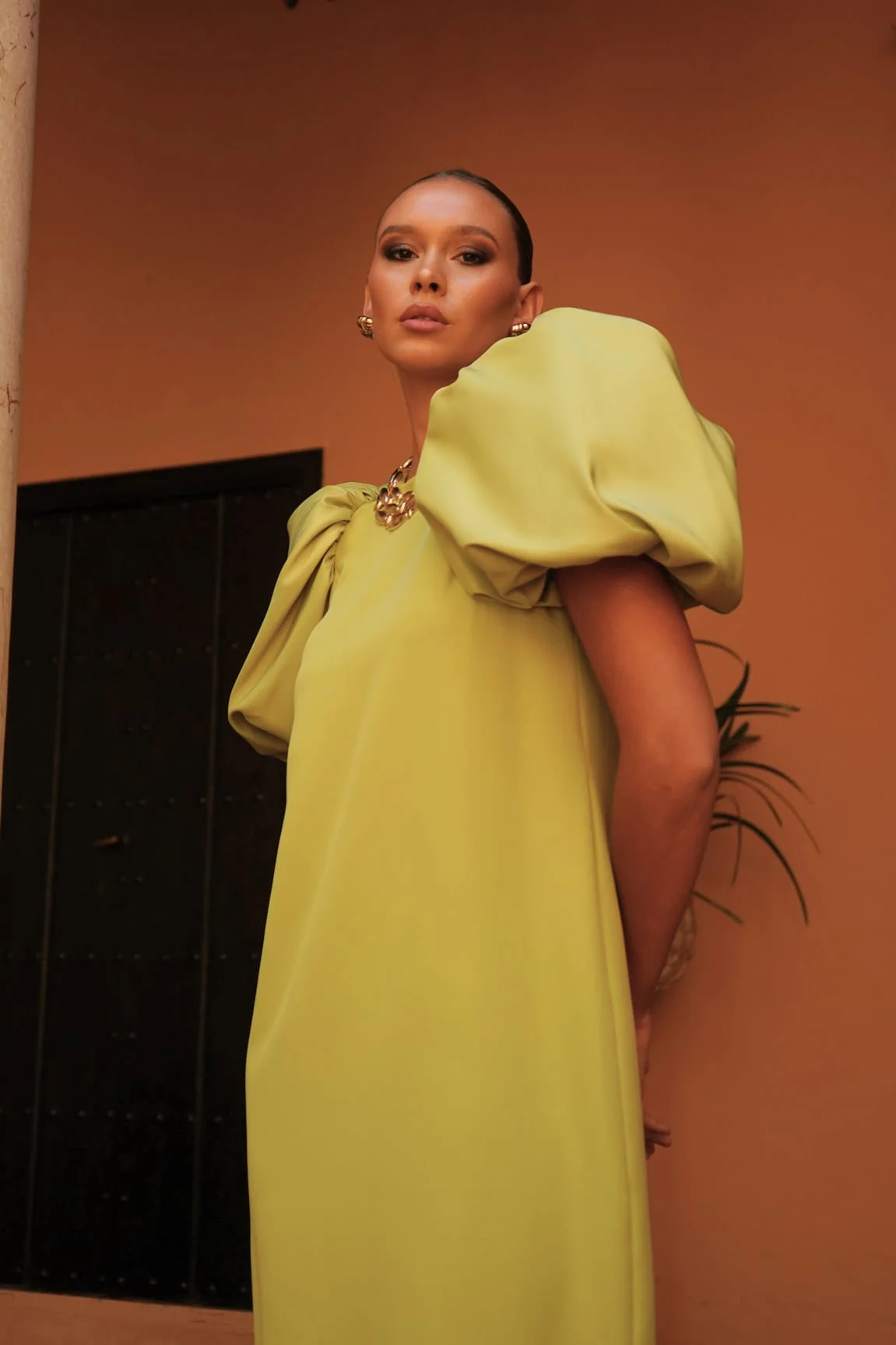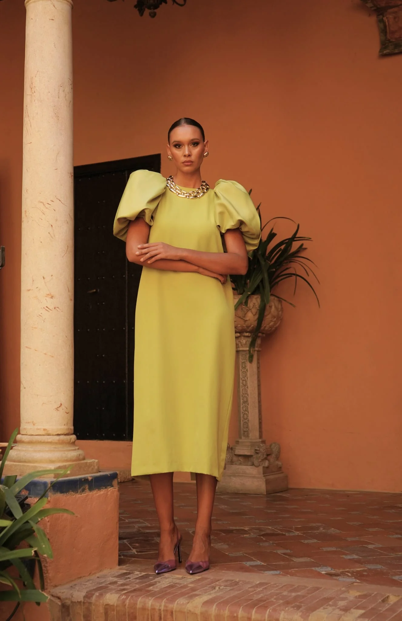 Vestido midi confeccionado en tejido fluido de alta calidad, diseñado para invitadas que buscan un look elegante y actual. Destaca por sus mangas abullonadas, que aportan volumen y personalidad al diseño, equilibrando la silueta de forma muy favorecedora.